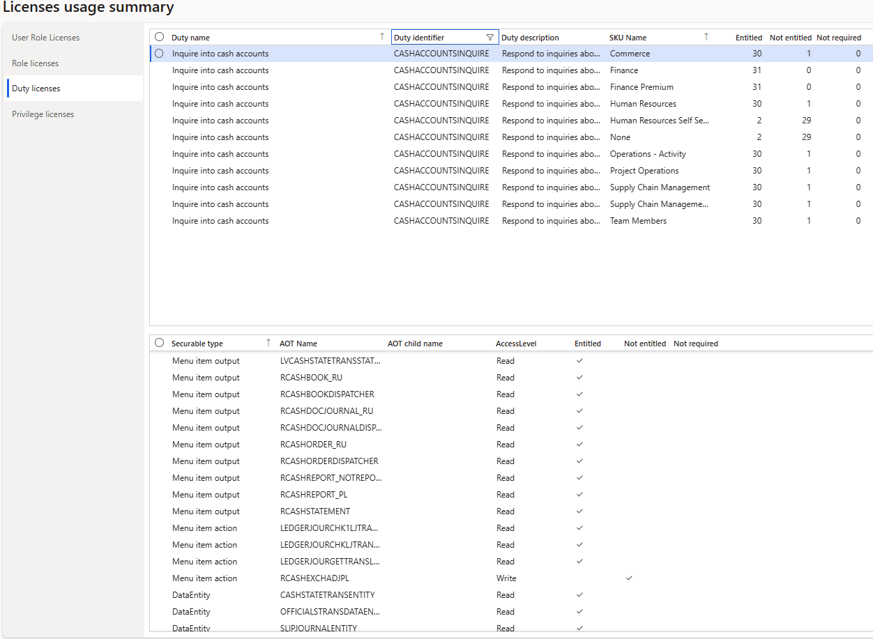 For example, the CashAccountsInquire duty has write access to the RCashExchAdjPl object which is causing the duty to require a Finance license: