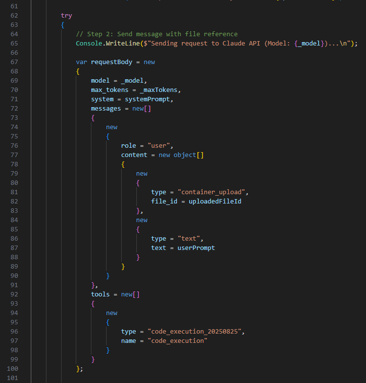 I then had to modify the request body slightly, to be able to utilize to include the file I uploaded as well as to tell Claude to use the ‘code execution’ tool with this prompt. If these changes were not made, I was getting a generic 500 error from the Claude API when submitting the request.